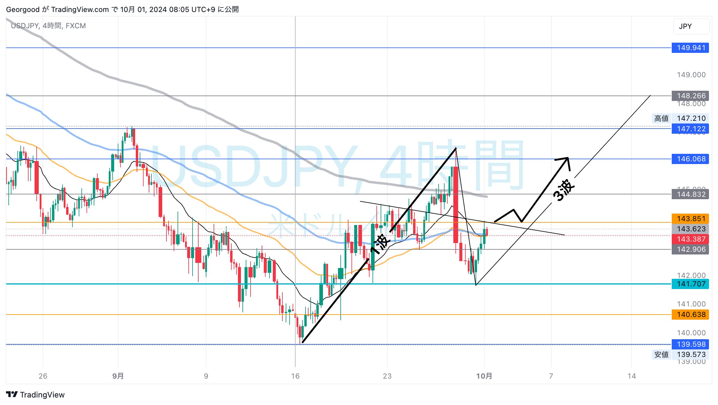 ドル円は週足で2波形成途中であり、4時間足では3波途中で斜め下のトレンドラインと143.85週足ラインからの押し目買いをイメージしてます。