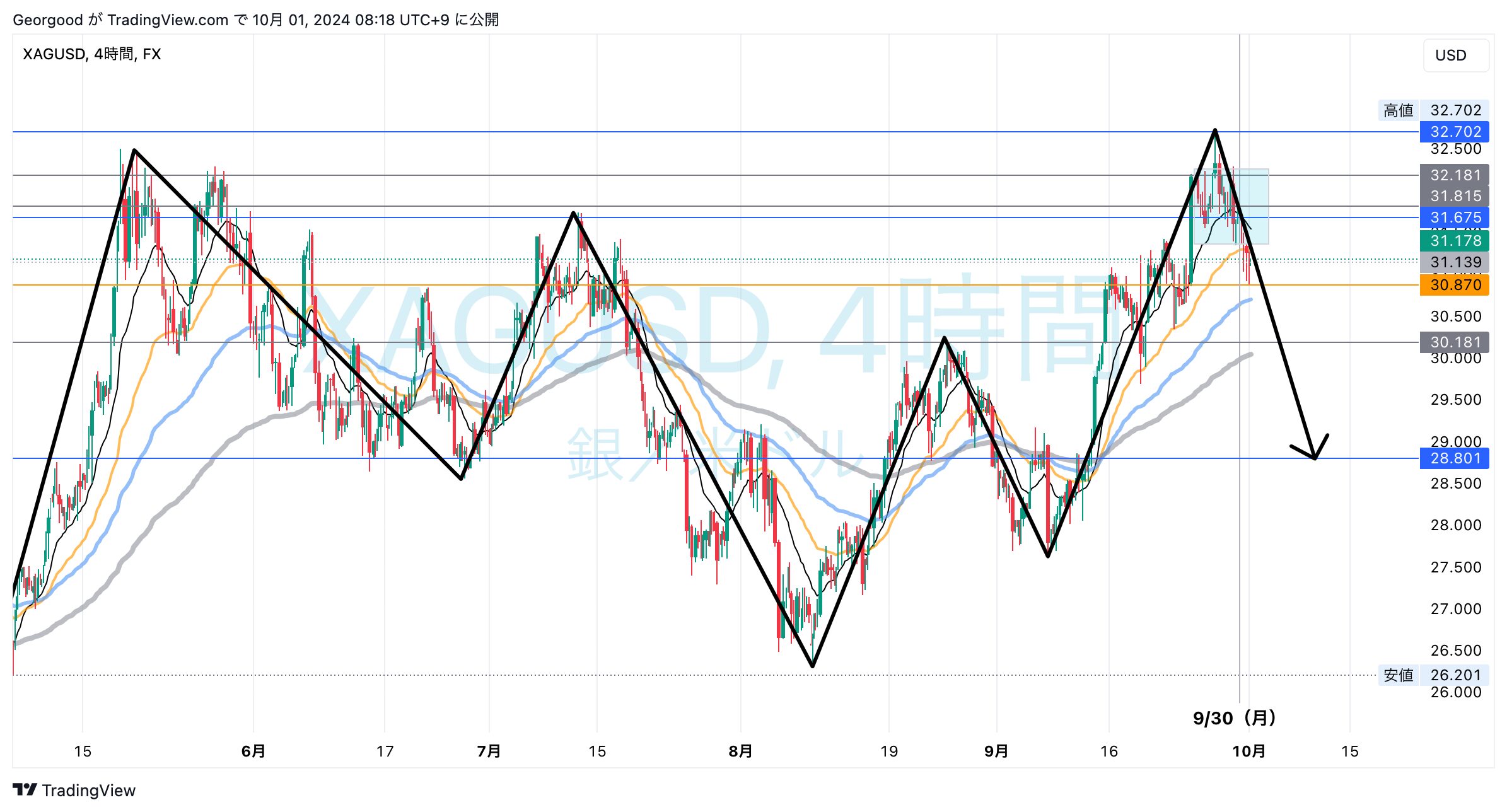 週足、日足、4時間足と逆三尊を形成しているので目線は下降ですが、途中にレンジもあるので一筋縄では行かなそうです。30.87週足ラインにアラート設定でここを下抜けしたら戻り売りのイメージを持っています。