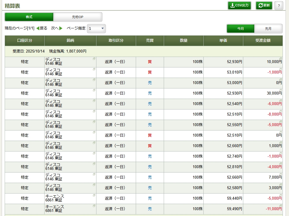 前半はキーエンスでー30000円まで行って、そこから資金不足で信用取引出来なくなってディスコへ移動した。