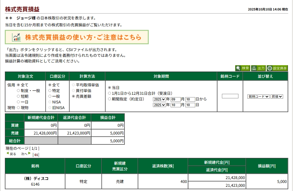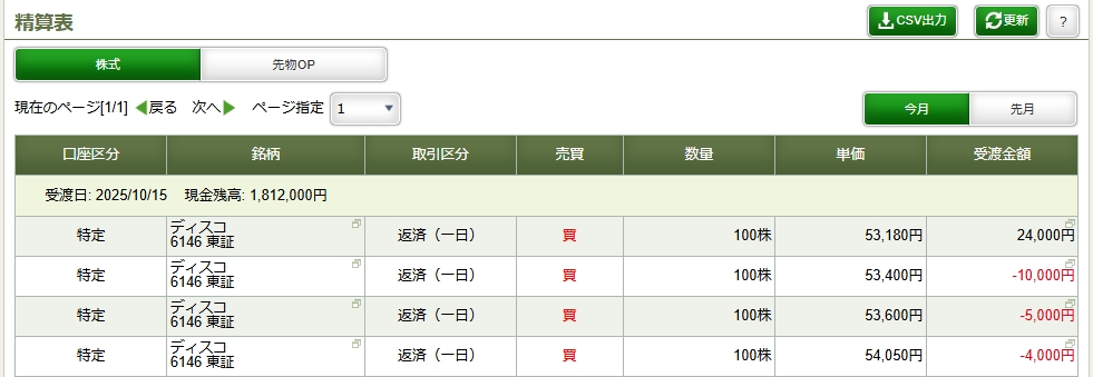 1本目と2本目は損切5000円で下目線の方向性はあってたけど上ヒゲが刺さって損切2発で9000円。後場寄り付きで、今度は損切り10000円にしたがまたもや反転上昇で損切り。そして最後に1:08から5340で空売りをして53180で利確。