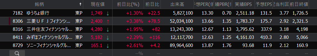 これがじわじわ効いてくるのが 8306三菱UFJ、8316三井住友FG、8411みずほFG。