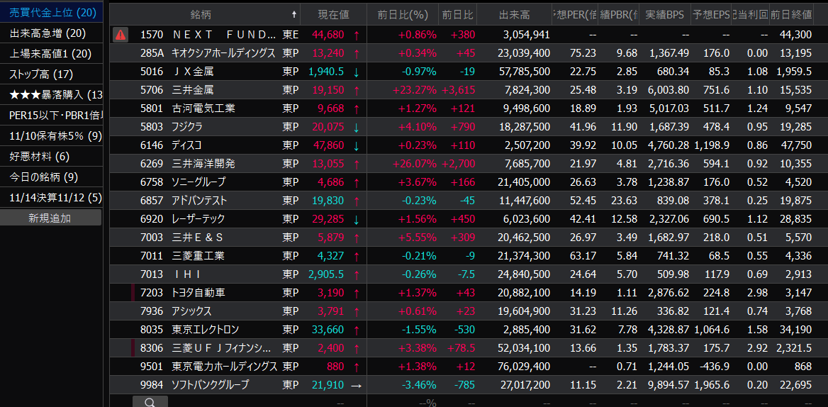 今日の売買代金上位で目立つのは三井金属23.23%と三井海洋開発26%UPがスゴイ上昇している。
