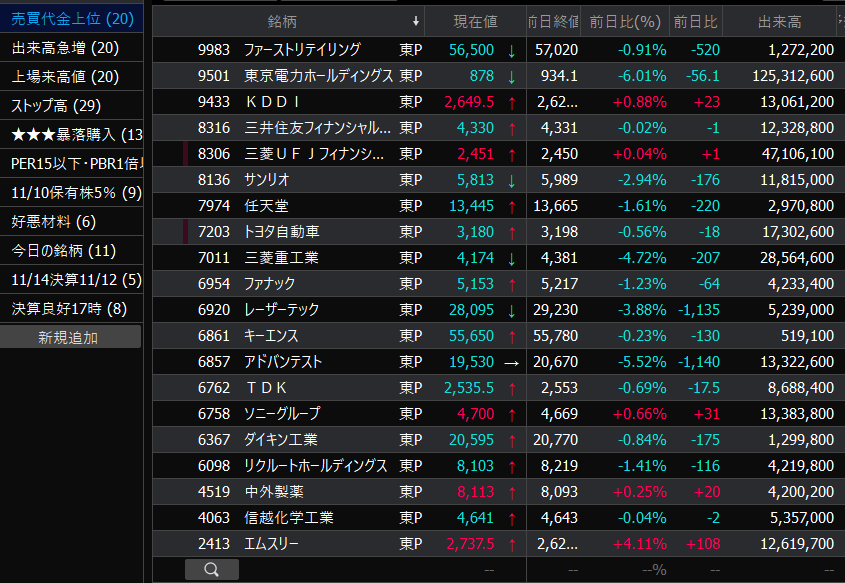 - 今日の売買代金上位は「全面調整」だけど、引けにかけて戻した分で需給はまだ生きてる。