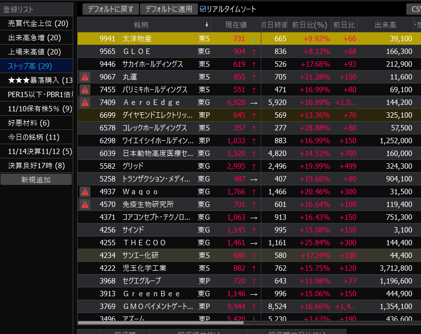🚀 20%以上上昇した注目ストップ高銘柄(11月14日)