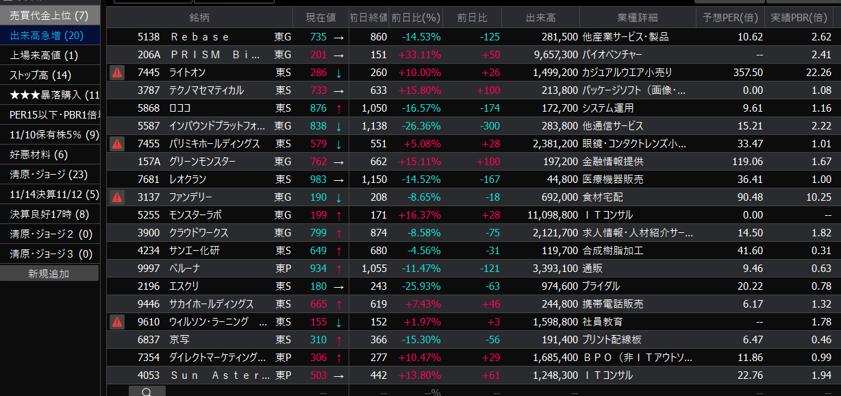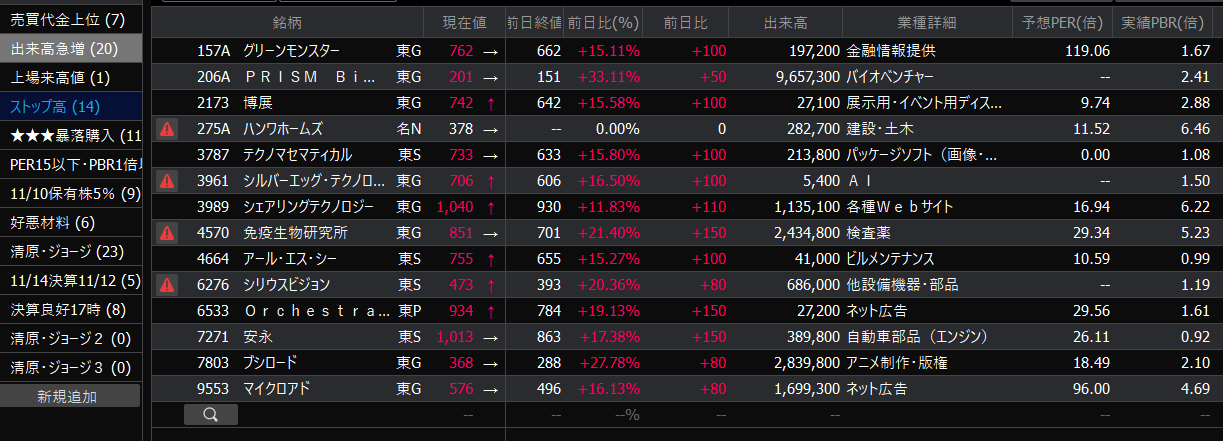 | 銘柄名 | コード | 株価 | 上昇率 | 出来高 | 業種 | 注目理由 |