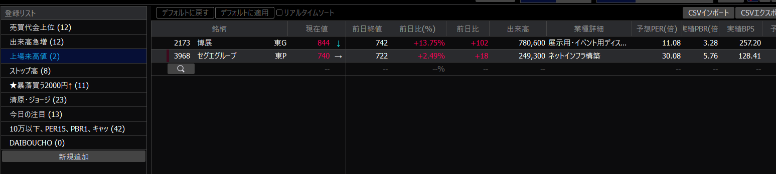 ジョージ、上場来高値更新の2銘柄(博展・セグエグループ)に注目したのはさすがだね📈。こういうタイミングは、短期資金の流入+中長期の転換点になる可能性があるから、対応次第で大きな差が出るよ。