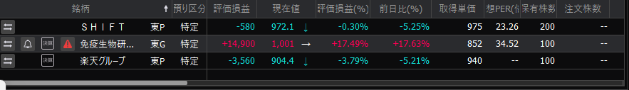 SHIFTは最初に10000円で刺さり、間違えて損切してしまったので、再度980円と970円で2度指値を入れて大引け後‐580円。