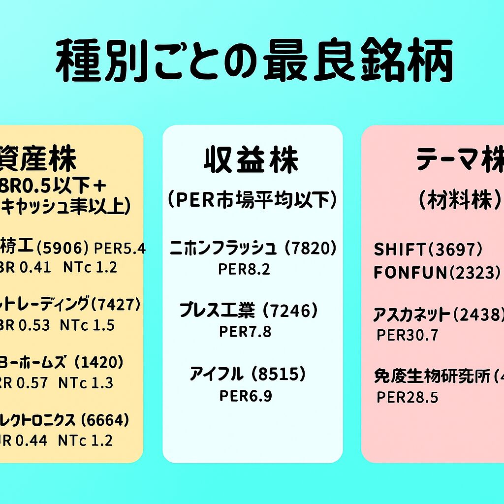 各銘柄の PER・PBR・ネットキャッシュ率 を加味し、資産株ロジックに適合するもの、安定収益を狙えるもの、短期テーマ性のあるものを明確にしています。