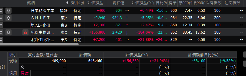 アイフル+1900円、日本乾溜+400円、SHIFT-9940 円、サンエー化研+2100円、免疫生物研究所+156800円、オプトエレクトロニクス+7200円