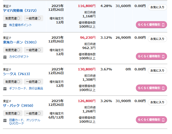 楽天証券にらくらく優待というのがあり、以下の条件でスクリーミングをかけてみた。