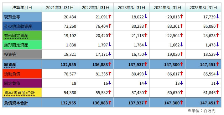 売上拡大に引きずられて膨張、総資産は 約1330億円 → 約1470億円へ増加。伸びの中心はその他流動資産(売掛金・在庫)と有形固定資産(物流・拠点) - 現預金