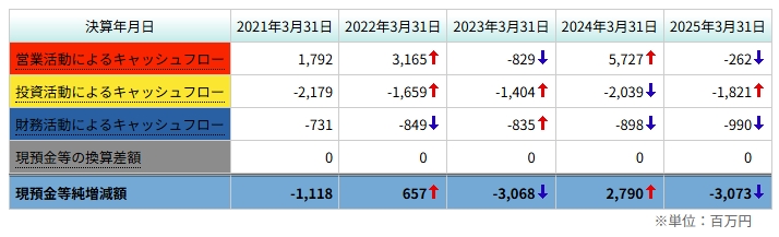 営業CFがプラスの年でも、投資CFで相殺されやすい。5年間トータルではFCFはほぼトントン〜ややマイナス。