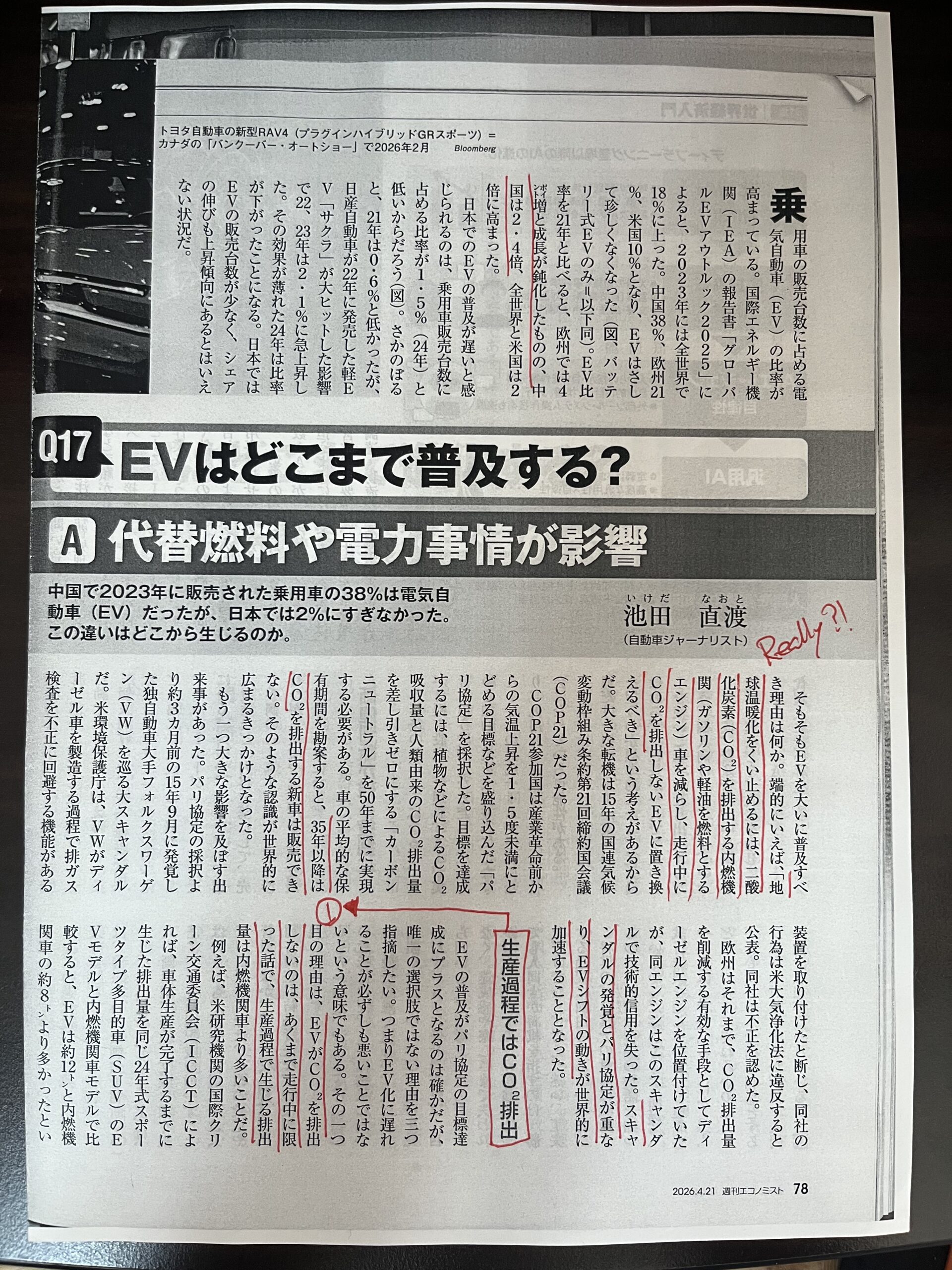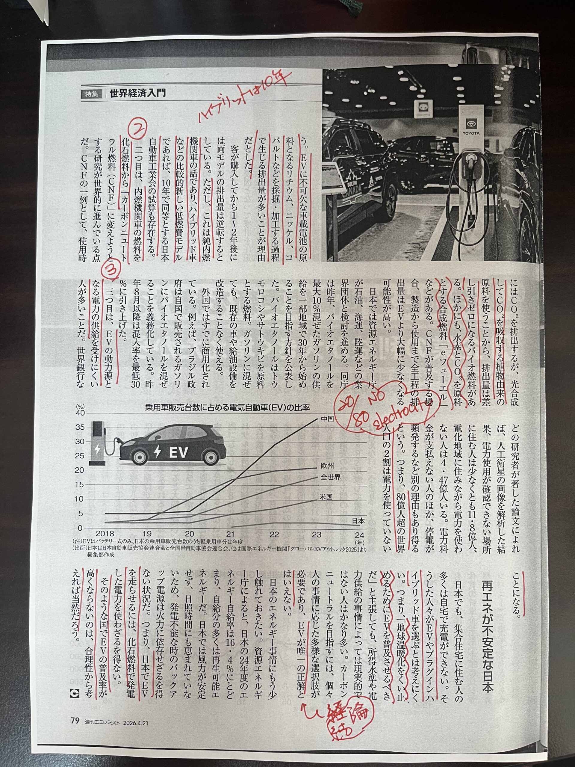 2026年4月21日号の『週刊エコノミスト』の特集「EVはどこまで普及する?」を読んだ。