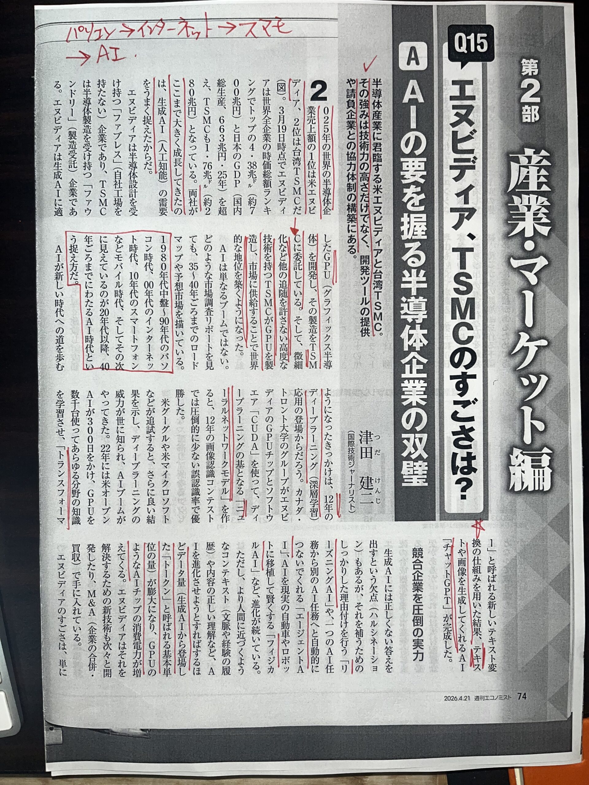 『週刊エコノミスト』の特集「エヌビディア、TSMCのすごさは?」を読み、改めてこの2社が築き上げた「堀(経済的溝)」の深さに感銘した。