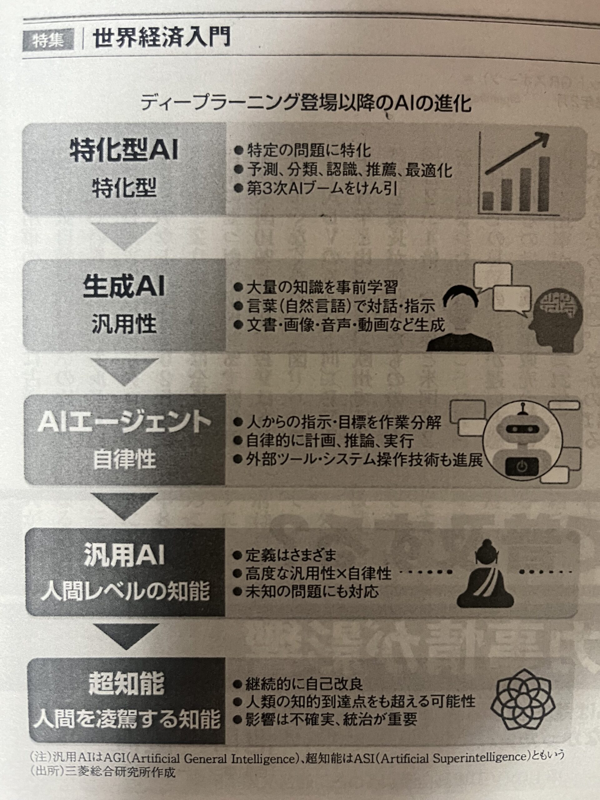 特化型から生成AI、そしてAIエージェント、汎用AI(AGI)へと至る流れ。
